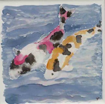 All the fish tiles have luster backgrounds and the fish shapes were saved with blue resist. Later, some of the fish are china painted.