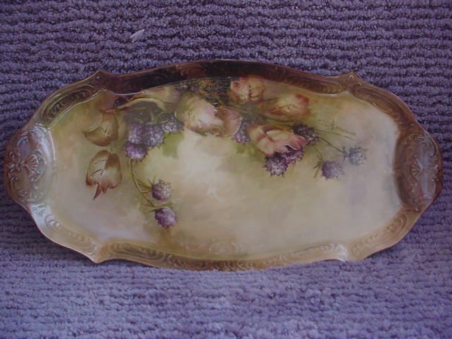 I will say to capture any porcelain works in a photo are really not possible.  Not with my work that is for sure.  It is not the design or the subject matter that really matters to me anymore but what is going on behind them.  I play with lights shadows and let these become part of my positive space.  So what is going on here is the tray looks rather empty on the bottom in a photo however the shadows follow around to the bottom and there is a link there that attaches it to the tray.  COLORS USED Leaves brown green and purple to come up with a soft gray shade of green. Then burgundy is added to warm the dark blackberry and tray. Same thing is used on edges of tray Blackberry are painted in with purple and black and then wiped out. Then in another fire they are warmed with a bright crimson. Stems are brown green. The background is brown green mixed with imperial purple and imperial purple with black green. Washes of this color and breaking up of background takes many fires. Here also a touch of golden highlight is used. Leaves and berries and design is washed over many times to put them into the background. my focus hopefully here on the cluster of berries and the bottom leaf and with the most light underneath them. The tray is very shiny and with a high glaze because of the many fires. I fire at 017 and the last fire at 018. I have played with color for years and unless you know what yours are doing your guessing at the outcome. test fire colors and combinations together. Learn your colors. Since getting ill one great thing has taken place in my artistic eye. Since I cannot paint I look at all work in magazines and studies and old prints. I have looked at them for sometime. I now can truly say no matter the skill of the artist you can find beauty in the work. After all we are all seeing with a different eye. I may think something is bad but when I look at the work I find there is a lesson in each piece that is good. Remember we are not here to paint alike. Each artist has a view of the holy mountain. Rembrandt, Van Gogh, Picasso, Jackson Pollock all saw the holy mountain in their own way. Each artist being totally different from the other. I cannot say I don't like the work because each is representing his work as he wishes and it is up to us to enjoy it for what it is. That is the way to view the art work on porcelain. One who finds there way and sticks with it does not change their way but over the years one learns to refine their work. There is so many out there that have done so. Youre an artist!!!!So paint like one and forget what the world around you says. If your happy in what your doing it is enough. CONCLUSION I hope this makes sense to you but with the high degree of poison in my system it is not only difficult to type but the thinking process suffers also. Hopefully you will understand. |