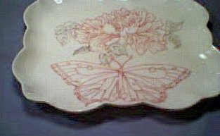 I then proceeded to paint the background. I applied three different lusters. "Iris" in the top left hand corner, "pretty pink" up to two thirds of the way down the plate and "lilac" on the last part. The plate was then fired again.