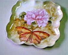 I drew the Peony and the butterfly on a sheet of paper, and then when I was satisfied with it, traced it on to the plate. I then outlined the flower and the butterfly with sugar water and iron red, and the leaves with sugar water and green. As the lines dry immediately, one can then begin painting. I started with the flower and using "porpora nuova" (new purple). I mixed my powder colour with fat oil until it has a toothpaste consistency, and then added turpentine to thin it down. Then I used two brushes to paint each petal. |