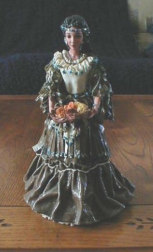 Lace should always be glazed to give it strength. Use a spray gun using about 40 lbs. of pressure. Only one thin coat is needed. If you put glaze on too thick it can cause burnout's. Wash off any glaze that gets on the skin areas. Or if you prefer, cover up these areas with tissue before glazing. It's almost impossible to brush glaze on and get an even coverage and you will work yourself to death trying not to fill up the lace/net holes. Glaze can be fired to many temps and it's usually recommend you fire to a Cone 2. (Never fire a lace draped glazed doll hotter than a Cone 3.) I don't do the glaze firing to a Cone 2 anymore, mostly to save wear and tear on my kiln. I generally fire to a Cone 03. The difference is the glaze fires INTO the piece at a hotter firing but sets on top with the lower ranges. I know that supposedly if you do not fire to a Cone 2, and do not use a glaze from the manufacturer of your porcelain, you are taking a chance on incompatibility and the glaze crazing. But I have never had any problems using whatever clear glaze I've had on hand and I've certainly never had any crazing on the lace. After your glaze firing, sand the face and arms with a piece of fine sand paper. This only takes a second. China paint your features and fingernails, using the same color for the lips, nails and blush. Adding a MOP (Mother of Pearl) type of luster on the dress is a nice touch.