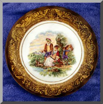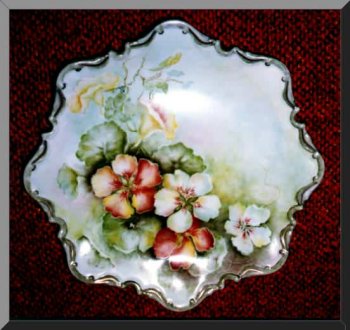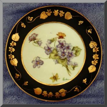![]() VIOLETS -This has an acid etched border covered with | The only thing I remember about the kiln was that it was bigger, taller, very heavy looking , black and uglier than the depot stoves of that time. I don't remember any of the details of that kiln, only that it was fired by kerosene, took days to heat and cool and was not fired very often. I don't remember very much about those first lessons but the young teacher, Fern Sumner had grown up some where in Texas with a Mother who was a china painter. So from the things I learned to do and remembered how to do, she must have been knowledgeable and and a good teacher. I don't know if my first supplies were ordered through the school or individually. I do know they came in a small wooden box from D.M.Campana, Chicago. It cost $3.95 and contained about 15 vials of Limoges paints, 2 bottles of MOP, a bottle of essence, several quill brushes, a large gold burnisher and several small rubber stamps, a small pallet knife and several small stumps. If there were other items I don't remember. Whether the tracing paper was included, or the pat of Roman Gold (45 cents) or whether they were bought extra I don't know. I still have much of these first supplies. |