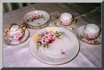and a breakfast set you may have seen on my web site. ------------- I guess that was what started me thinking about the time I was spending doing ceramics. That wasn't what I wanted to do or collect or even keep. I wanted to paint china. I still didn't know anyone who painted and I didn't have a kiln of my own. I worked part time, had a teenage son and a small child and a busy husband so my days were full enough but I wanted to learn something. I tried to find books or any information on Tole Painting. Nothing. So Dolls and Lace Draping. Again I found nothing. There was no City Library to appeal to. Things just drifted.