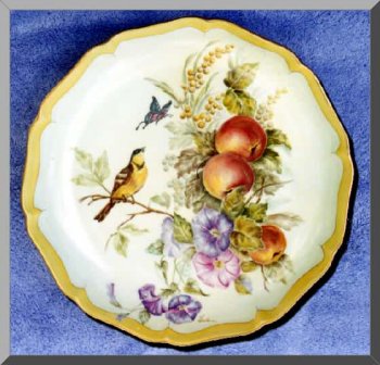 to stay until it was fired. I began painting almost non-stop. My husband couldn't have been more supportive. He was as interested in seeing each piece come from the kiln as I. I went to my first convention in 1985 and crammed in every demo I could. I've lost count of the seminars-one day or a week and the demos and conventions I've attended and learned from. I learned from every one. Some had good teachers, some good painters, some real artists, some poor painters, but I learned and I painted. I have learned that too many of the teachers started painting and had no background for art principles, even basics in china painting, i.e. how to mix paint, how to load a brush, how to design or how it could be arranged to have negative and positive areas etc. Most, I think, started because a friend said "pleezz teach me". But I do criticize now, if they have continued to teach without teaching themselves so that they, as a teacher, can include this basic knowledge to their students.. So how has china painting changed over the years. Like most everything else in the world today -- in every way -- but we are still decorating china to make it more attractive and beautiful and to satisfy something in us that wants to 'create' what is beautiful to our eye. Fine art? You decide. My apologies for including so much of my personal life in this and making it so long (but it has been a LONG life!) and I find it hard to separate the two,