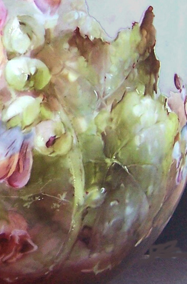 Go out to your garden and pick some live specimens along with a flower or two. Notice how the leaves look behind the flower or fruit you have just picked, (or borrowed anonomously from your neighbor) and the structure of the flower. You know, if they branch off from each other straight across or stagger. Sketch the leaves loosely on your china, (please note a nice tracing is a-okay with me) with a china pencil, ultra-fine Sharpie or paint on a liner brush. Here are some colors that you can use that maybe you haven't tried yet: