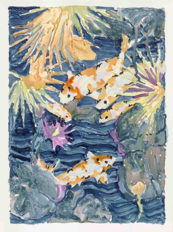 All the fish tiles have luster backgrounds and the fish shapes were saved with blue resist. Later, some of the fish are china painted.
