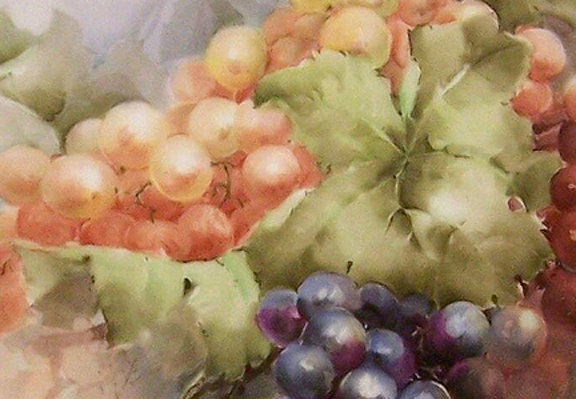 Go out to your garden and pick some live specimens along with a flower or two. Notice how the leaves look behind the flower or fruit you have just picked, (or borrowed anonomously from your neighbor) and the structure of the flower. You know, if they branch off from each other straight across or stagger. Sketch the leaves loosely on your china, (please note a nice tracing is a-okay with me) with a china pencil, ultra-fine Sharpie or paint on a liner brush. Here are some colors that you can use that maybe you haven't tried yet: