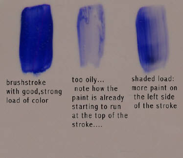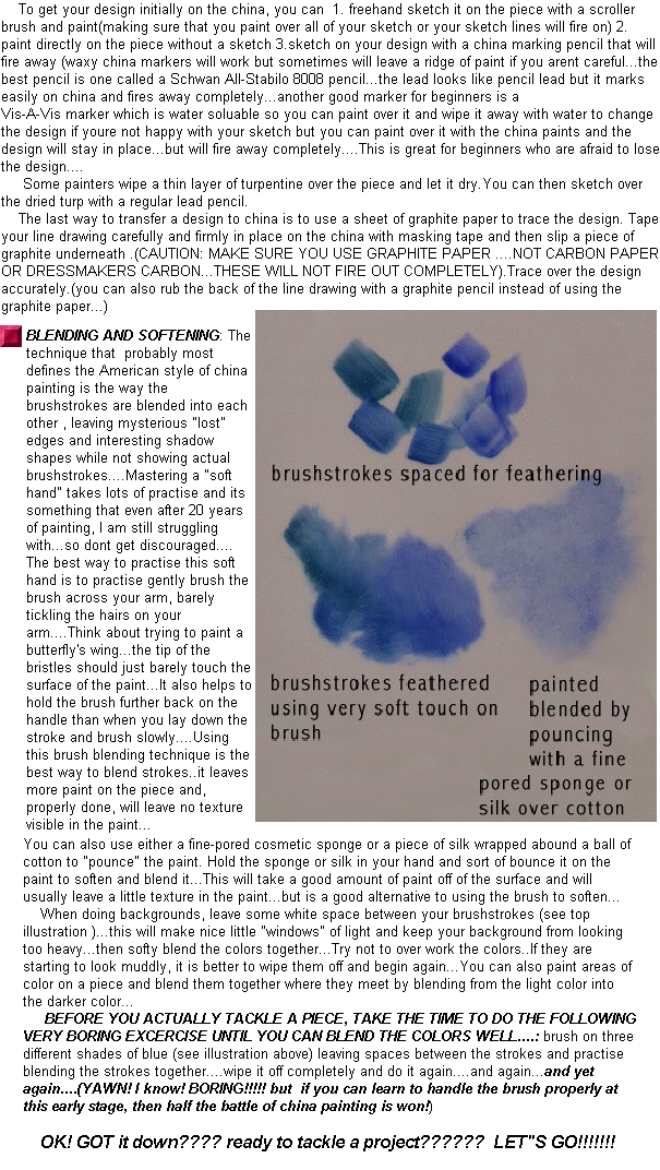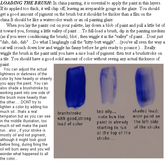 LOADING THE BRUSH: In china painting, it is essential to apply the paint in thin layers. If its applied too thick, it will chip off, leaving an irreparable gouge in the glaze. You should get a good amount of pigment on the brush but it shouldn't be thicker than a film on the china. It should be like a watercolor wash or an oil painting glaze.