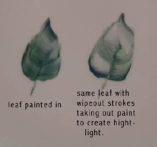 To do this, you paint in the color, forming the leaf (as an example).....Then, blot the color out of your brush (it usually isnt necessary to clean the brush in solvent....altho sometimes you might want to wiggle it in the painting medium to get most of the paint out....make sure you blot the brush well to take out the oil...) ....Wipe back some of the color where you want to show highlights...these should be pretty light because you will come back over them on the next fire with a wash of color..... Sometimes, if you are