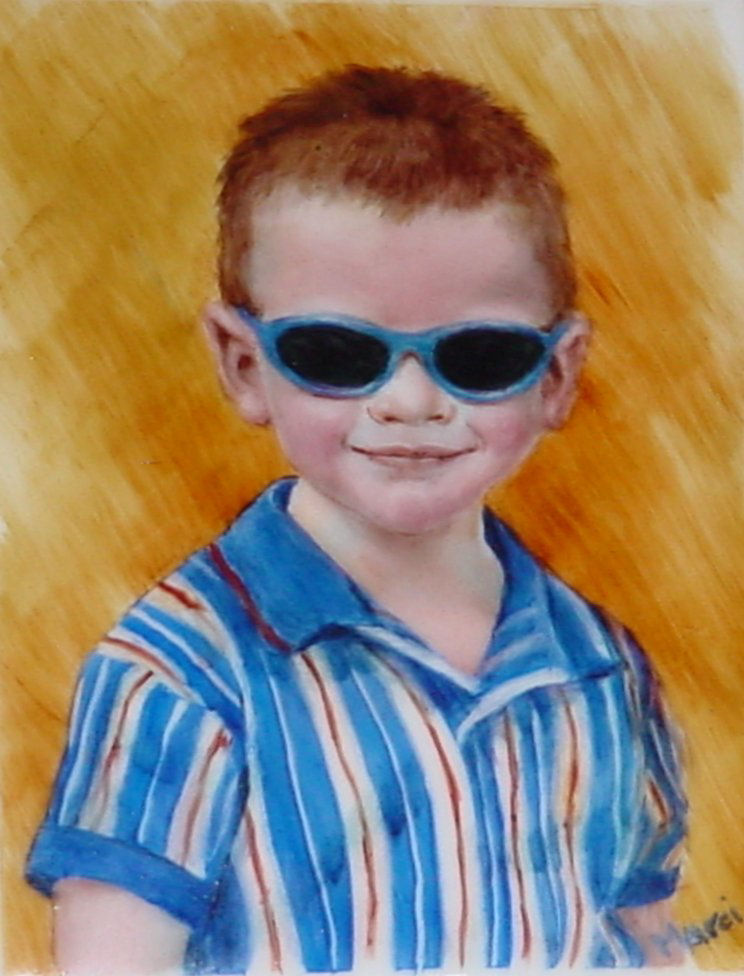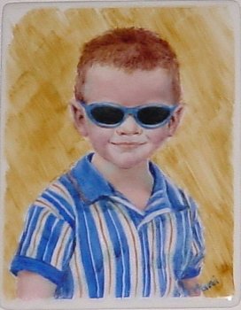 Even a high key painting done primarily with light and middle values needs a dash of dark . Below is a miniature painting I did of one of my students at the preschool I taught at . It is on a 2 1/2 x 2 inch tile . I entered the piece in the Florida Miniature Society show where it was juried into the show.. but was never returned to me.. so all I have are the photos and they are not the greatest photos.. Bear with me a second: I have to tell you a little story about Corey before I go on. I taught Corey when he was 4 ...and he was a great little kid... smart and full of curiosity..and you know what THAT usually means( grin) He and his best buddy Logan ( who I also painted) were not always IN trouble.. but were usually in the close vicinity . One morning, I got to work to discover that , after I had gone home for the day and transfered the kids who had not yet been picked up by their parents to the 5 year old room , somehow the 30 gallon fish tank in the room "accidentally " broke when a couple of kids decided to attract the fishies' attention by tapping on the glass with wooden blocks.. As it turned out, Corey was sitting at a table happily coloring when the "excitement"occurred... But we all had a great laugh when his mother brought him in the next morning with a tee shirt on that said :" I was nowhere near it when it happened!" ... OK ... back to the piece: The first picture shows the next to last fire... I almost left it alone at this point because I was trying to get very subtle skin tones and they kept firing out... I FINALLY got the skin tones to the point that I was reasonably happy with them... but it was not quite right.. The dilemma: Do I add those little hits of darkness .... the " zingers" as Jane Marcks calls them, that make the difference and risk firing this piece again.. or do I leave it as is? I decided to take a shot... I added some tiny dashes of dark ( lips, shirt , hair, glasses ) .. deepened a few other areas...and especially went for it on the background.. You can see the huge difference thjose small bits of dark made...especially in the background. Note how the darker hits of color in strategic places really makes Corey pop! Of course, if it had all fired out again, I would be kicking myself ... but...no guts.no glory So the next time your painting is looking alittle bland, spice it up with some darkest darks.... |