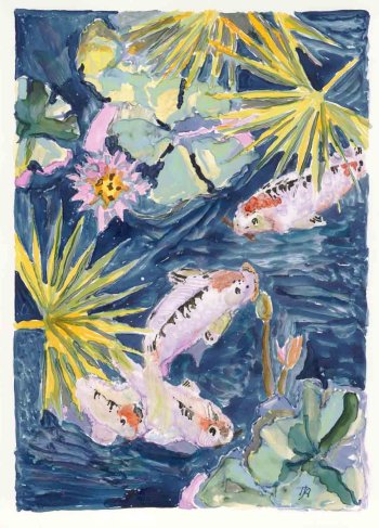 All the fish tiles have luster backgrounds and the fish shapes were saved with blue resist. Later, some of the fish are china painted.