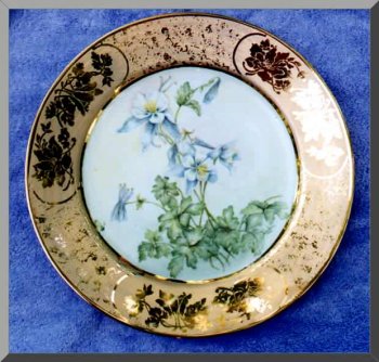 ![]() VIOLETS -This has an acid etched border covered with | The only thing I remember about the kiln was that it was bigger, taller, very heavy looking , black and uglier than the depot stoves of that time. I don't remember any of the details of that kiln, only that it was fired by kerosene, took days to heat and cool and was not fired very often. I don't remember very much about those first lessons but the young teacher, Fern Sumner had grown up some where in Texas with a Mother who was a china painter. So from the things I learned to do and remembered how to do, she must have been knowledgeable and and a good teacher. I don't know if my first supplies were ordered through the school or individually. I do know they came in a small wooden box from D.M.Campana, Chicago. It cost $3.95 and contained about 15 vials of Limoges paints, 2 bottles of MOP, a bottle of essence, several quill brushes, a large gold burnisher and several small rubber stamps, a small pallet knife and several small stumps. If there were other items I don't remember. Whether the tracing paper was included, or the pat of Roman Gold (45 cents) or whether they were bought extra I don't know. I still have much of these first supplies. |